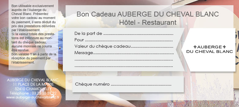 Le bon cadeau de l’Auberge du Cheval Blanc peut être établi au montant de votre choix et est valable au Resaurant ou à l’Hôtel